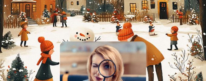 Nedenfor ser du et bilde av et snødekt torg der folk går. Noen leker med snøballer, noen lager en snømann eller bare beundrer vinterlandskapet.