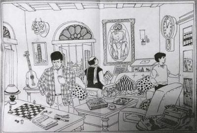 5. Den yngste personen på bildet er gutten til høyre. Han ser på bøker. Men hvis du ser på skjorten hans, vil du legge merke til at han har et langt erme på den ene siden og et trekvart erme på den andre siden.